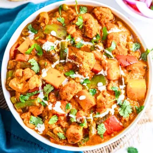 a hearty dish with a medley of vegetables cooked in a spiced, savory sauce.