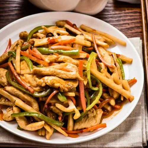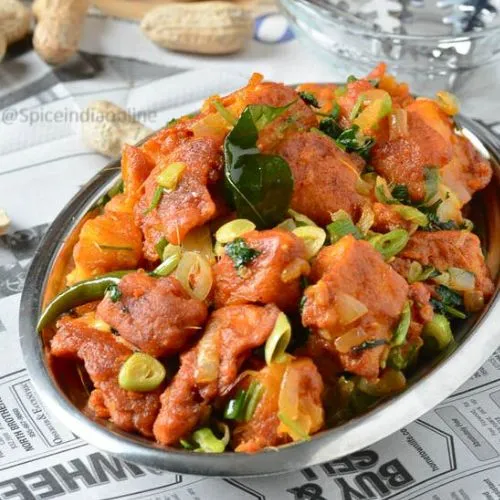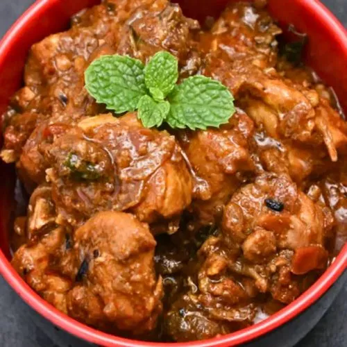 a flavorful dish featuring tender chicken cooked in a spiced, tangy sauce.