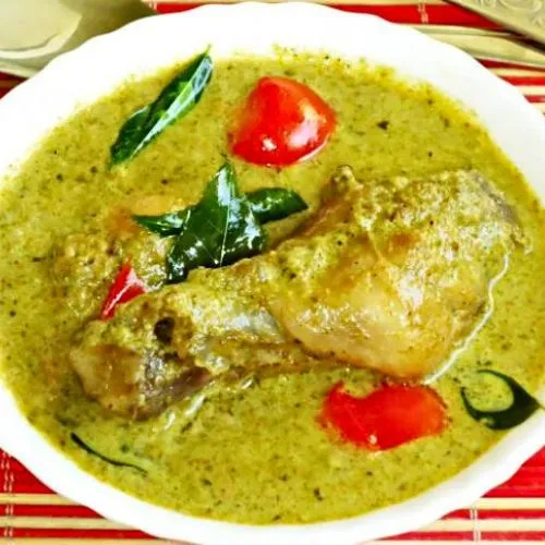 a tangy, spiced dish with a vibrant green sauce made from herbs and spices.