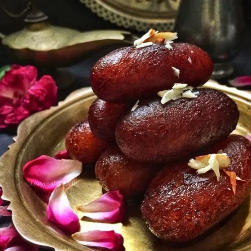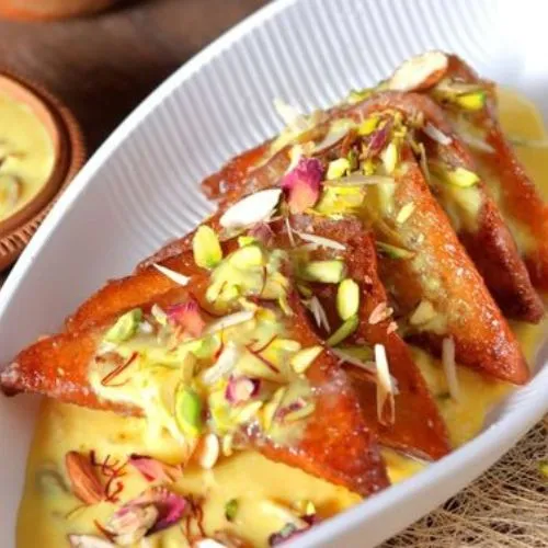 a delectable Indian dessert made from deep-fried dough filled with sweetened khoya, perfect for festive celebrations.