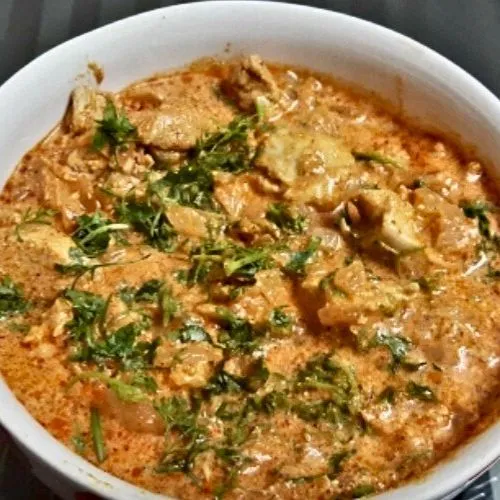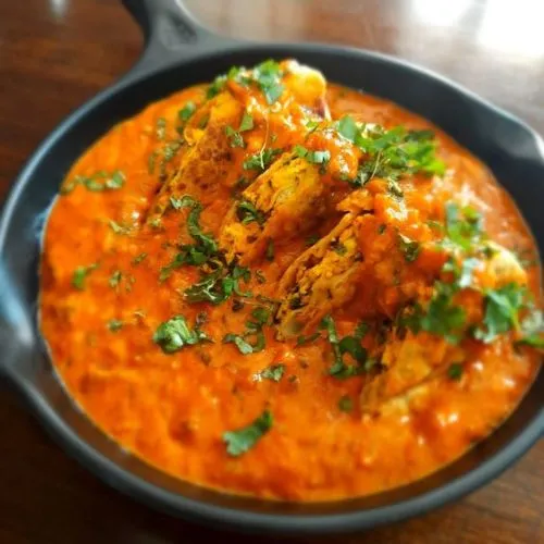 a rich, flavorful dish with tender chicken cooked in a spiced, creamy sauce.
