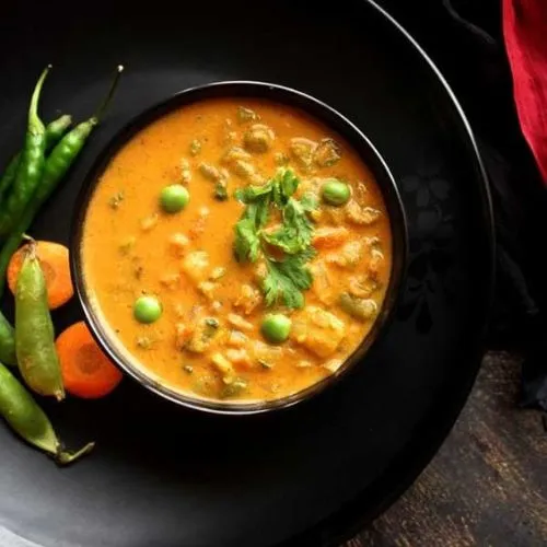 a creamy, mildly spiced curry made with mixed vegetables and nuts.